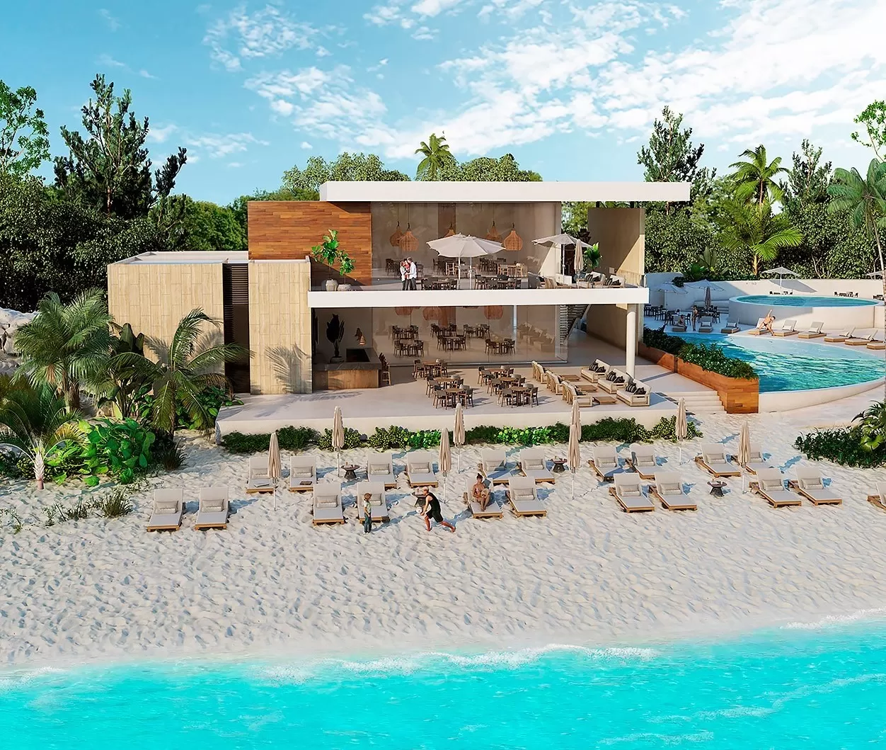 The exclusive Xpu-Ha beach residential resort beach club is developed on a 2-hectare plot with extensive green areas, pools, restaurant/bar, parking, and 24/7 security.